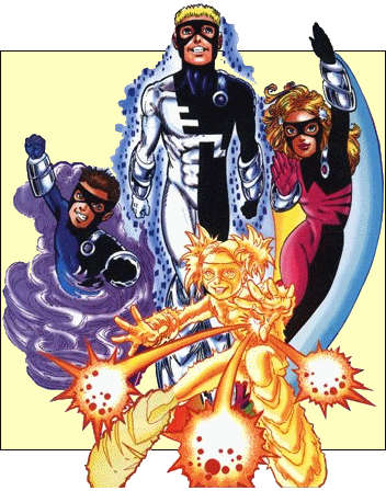 Alex took, the name "Gee" due to his power over gravity ("G-power"), Jack called himself "Mass Master" because he could take gaseous form or compress his mass to as to become tiny, Julie called herself Lightspeed became she could fly fast, leaving a trail of colored light behind her, and Katie became the Energizer, due to her ability to store energy and fire iter body