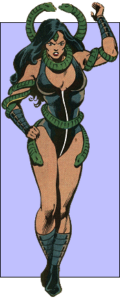History: Tanya Sealy was selected by executives in the Roxxon Oil Company to be a special agent in covert operations. At the Mutagenics Laboratory of Roxxon's subsidiary, the Brand Corporation, Sealy underwent an operation to surgically implant a special component in her forebrain, enabling her to tap her brain's energy in a unique way. Her first field mission was joining the new Serpant Squad in their attempt to retrieve the Serpent Crown. She remained with the nucleus of the group when they went freelance. Months later, she and her cohorts were invited to join the Serpent Society, an organization of mercenary costumed criminals. She readily accepted the invitation, savoring the prospect of steady income.