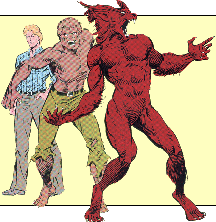 Except during the three nights of the full moon, Russell retains his full human intellect as a werewolf. He is also capable of speech during the same period, although speaking is difficult, painful, and often hard to understand. Russell effects his transformation into a werewolf through a conscious act of will, usually by meditating upon the mental image of the full moon. Due to Malus's treatments, the Werewolf has a more wolflike form during nights of the full moon, with a longer snout and ears, a curved spine, and lupine jointed legs. Russell retains his original werewolf form when he transforms at other times.