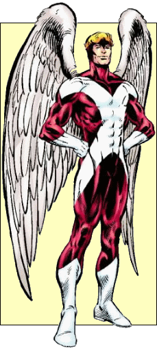 KNOWN SUPERHUMAN POWERS: Angel is a mutant who can fly by means of his natural. Fully feathered like a bird's, the wings have a very flexible skeletal structure, enabling him to press them to the back of his torso and legs with only the slightest bulge visible under his clothing. His wings have superhuman strength and can create enough lift to enable him to carry aloft at least 500 pounds in addition to his own weight. Angel's entire anatomy is naturally adapted to flying. His bones are hollow like a bird's, making him weigh far less than usual for a man of his build. His body is virtually devoid of fat and possesses greater proportionate muscle mass than an ordinary human does.