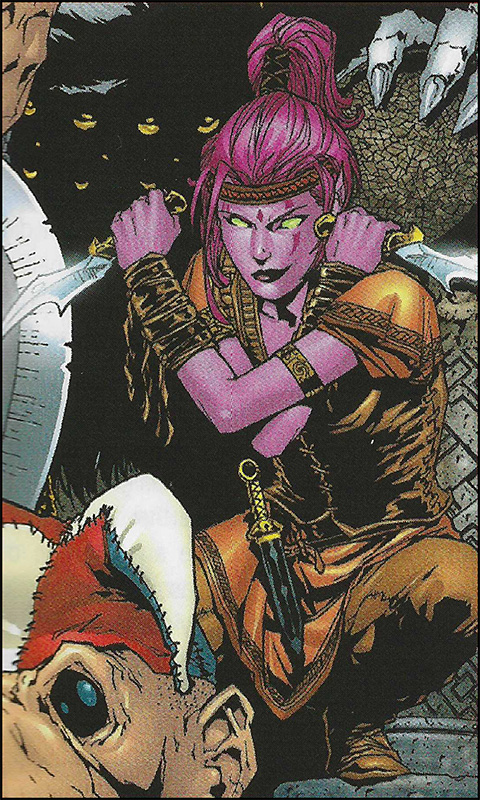 Clarice Ferguson, known as Blink, is a mutant native to Earth-295, the dystopian reality known as the Age of Apocalypse. Born with magenta skin, pointed ears, and distinctive facial markings, she was visibly a mutant from birth. At age four, her parents immigrated to the United States seeking medical answers for her appearance. When Apocalypse seized control of North America on Earth-295, Mister Sinister murdered her parents and placed Clarice in the Breeding Pens. There she endured genetic experimentation by Dark Beast and abuse from the Sugar Man, while forming a close friendship with fellow prisoner Illyana Rasputin. During these experiments, Clarice’s mutant teleportation powers manifested. She adopted the codename “Blink” after the sound her portals emitted.