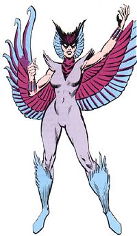 Unusual Features: Deathbird, like all Shi'Ar, has a plume of feathers instead of a head of hair. She has wings with purple and blue feathers growing from her back, attached from armpit to wrist,