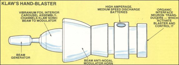 Weapons: Klaw wears a prosthetic device composed of molybdenum steel which contains a miniature version of his sound converter machine. The artificial hand is attached to his sound/mass body by as yet unknown means. Klaw activates the circuitry of the device by pseudo-cybernetic commands.
