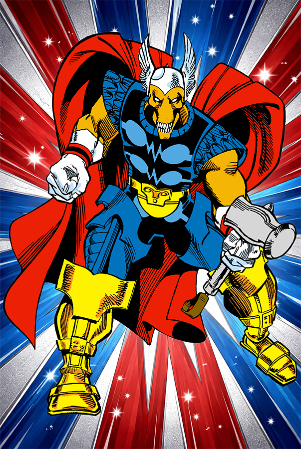 While scouting ahead of the fleet, Bill encountered Thor after being detected by S.H.I.E.L.D. as a potential threat. The two warriors clashed, and during the battle Bill proved worthy of lifting Mjolnir, gaining the power of Thor. Recognizing Bill’s honor, Odin decreed a trial by combat between Thor and Bill. After Bill emerged victorious, Odin had the dwarven smith Eitri forge Stormbreaker, a hammer equal in power to Mjolnir, granting Bill his own divine weapon.